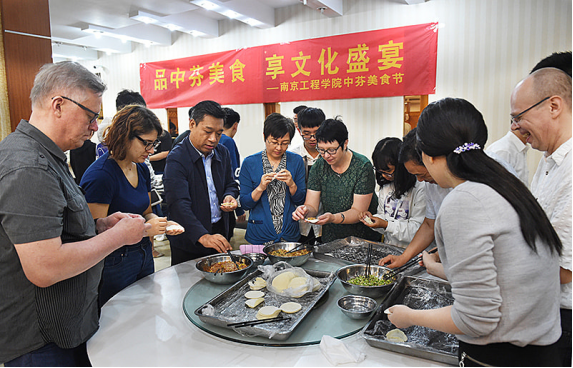 After experiencing the paper-cutting, Finnish teachers and students visited the Yiheng Restaurant to enjoy the Sino-Finnish feast. Teachers and students carefully prepared ingredients and seasonings. With a clear division of labor, the team cooperated tacitly, and the kitchen was busy. Cao Xuehong (Deputy Secretary of NJIT) with the Chinese and Finnish teachers and students prepared dumplings together and had cordial discussions with teachers and students. Finnish teachers learned through making, and rapidly mastered the skills. The dumplings they made were tasty. After nearly two hours’ preparation, Finnish teachers made traditional Finnish pancakes and salmon soup, while Chinese teachers and students cooked Chinese specialties, including pipa prawn, kung pao chicken, pickled fish, Mapo Tofu. All participants enjoyed the delicious food and shared the experience together. Teachers and students said that they appreciated Chinese and Finnish culture by experiencing the traditional culture and cuisine of both countries, and appreciated their enjoyment and responsibility as a member of the family of the Sino-Finnish classes. They intended to become ambassadors for the Chinese and Finnish cultural exchange and contribute towards creating a cultural communication bridge between China and Finland.