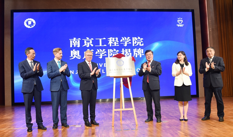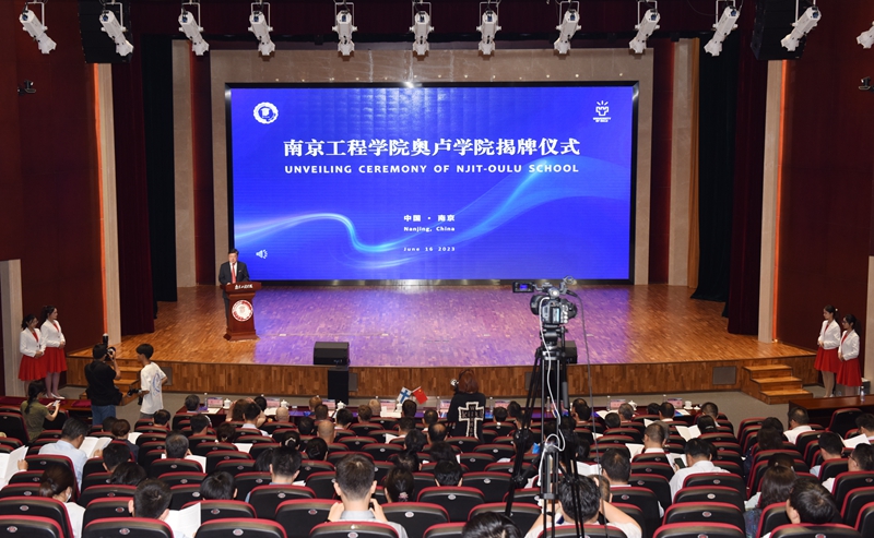 On June 16, the Unveiling Ceremony of NJIT-Oulu School, a Chinese-foreign cooperatively-run school of non-independent legal entity jointly declared by Nanjing Institute of Technology (NJIT) and the University of Oulu (UO) in Finland, was held in the Tianyin Conference Center of the High-tech Park. Mr. Olli Suominen, Counsellor of Education and Science, Embassy of Finland in China, Mr. Tapio Koivu, Vice Rector of the University of Oulu, Ms. Lukia Yang, Programme Officer of China Office of the Finnish National Agency for Education, Mr. Qian Wenhua, Vice President of Jiangsu Provincial People’s Association for Friendship with Foreign Countries, Committee Member of Foreign Affairs Office of Jiangsu Provincial People’s Government, Ms. Ru Yixian, Deputy Director of Office of Foreign Cooperation and Exchange of Jiangsu Provincial Department of Education, Mr. Xia Yan, Deputy Director of Foreign Affairs Office of Nanjing Municipal People’s Government, Mr. Liu Zheng and Ms. Zhang Xin from Office of Europe and Africa, Foreign Affairs Office of Nanjing Municipal People’s Government, and all leaders of NJIT’s University Committee attended the unveiling ceremony. The ceremony was presided by Deputy Chair of University Council of NJIT, Mr. Pu Lijie.