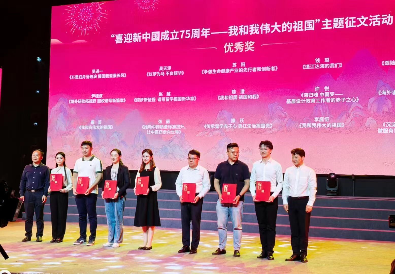 9月28日,江苏省欧美同学会(江苏省留学人员联谊会)庆祝中华人民共和国成立75周年主题活动在苏州湾大剧院举办。省欧美同学会会长、南京大学校长、中国科学院院士谈哲敏,苏州市欧美同学会会长、苏州大学苏州医学院院长、中国工程院院士詹启敏,省委统战部副部长周伟文,苏州市委常委、市委统战部部长、市委秘书长王飏出席活动。活动期间举办了“我和我伟大的祖国”征文比赛颁奖活动。太阳集团许悦老师的征文作品《海归魂 中国梦—...