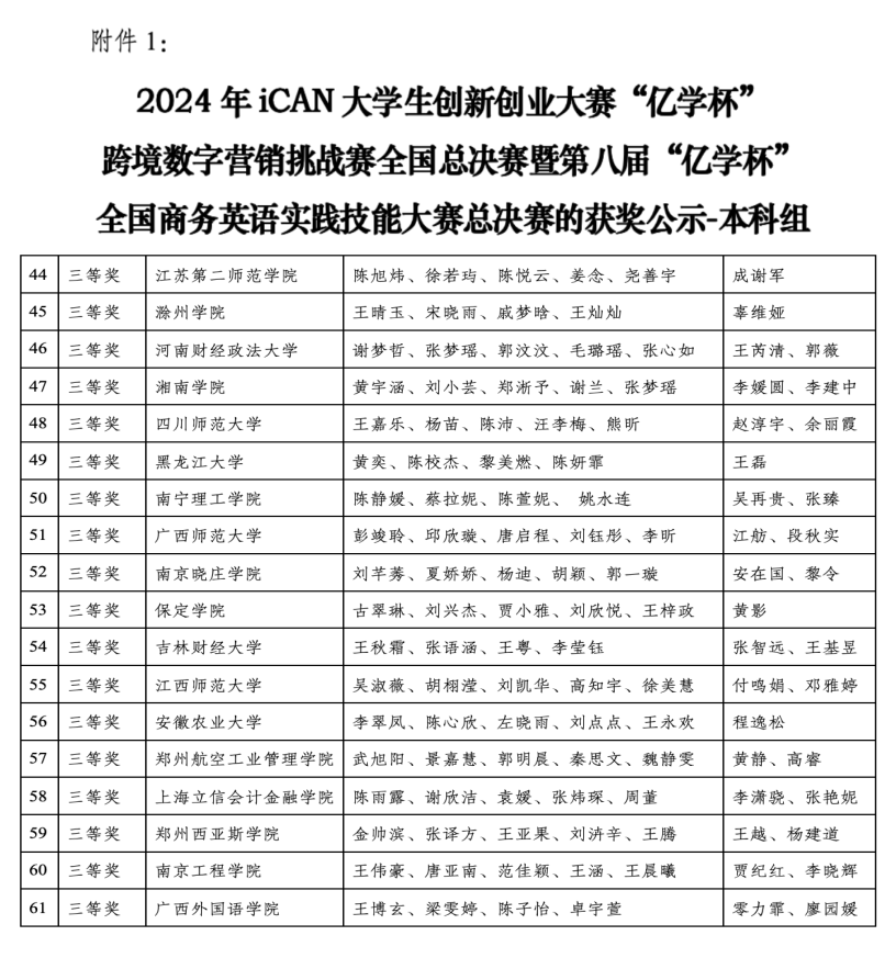 近日,2024年iCAN大学生创新创业大赛“亿学杯”跨境数字营销挑战赛全国总决赛暨第八届“亿学杯”全国商务英语实践技能大赛总决赛成绩揭晓,由太阳集团外国语学院王伟豪、唐亚南、范佳颖、王涵和王晨曦等同学组成的团队(指导教师:贾纪红、李晓晖)荣获本科组全国三等奖。此次比赛共有300多所高校600余支队伍参加,分为跨境数字营销平台赛和跨境数字营销策划方案两部分。外国语学院精心备赛、选拔团队,利用亿学商务知识平台,对学...