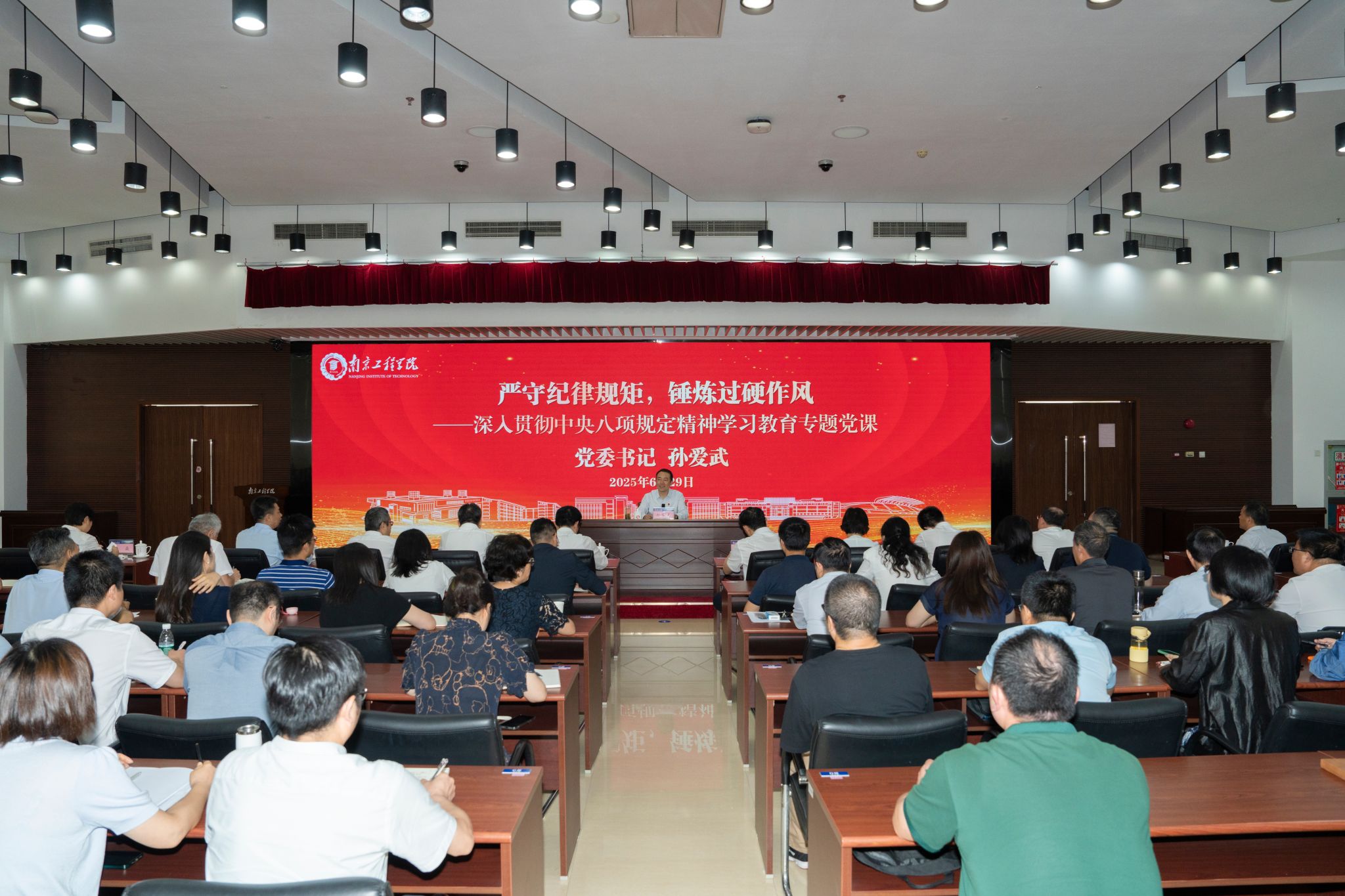 在中国共产党成立104周年之际,6月29日上午,党委书记孙爱武为学校党员干部讲授深入贯彻中央八项规定精神学习教育专题党课。孙爱武以《严守纪律规矩,锤炼过硬作风——深入贯彻中央八项规定精神学习教育》为题,紧密联系学校实际,系统讲解了开展学习教育的重大意义和实践要求。他指出,要深学细悟习近平总书记关于加强党的作风建设的重要论述。深刻领会加强党的作风建设的重要意义,切实从关系党的生死存亡的战略高度认识和把...