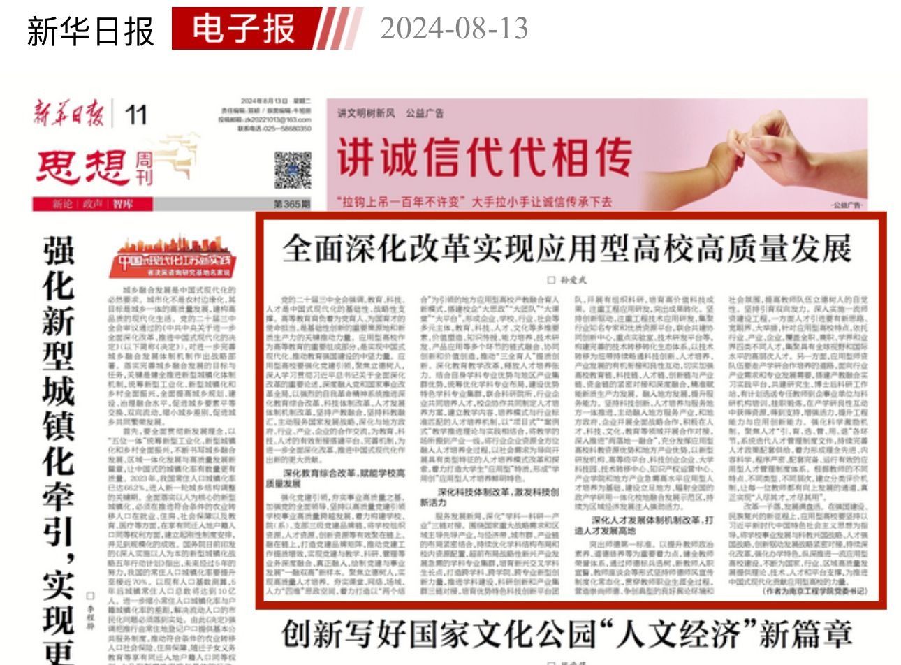 8月13日,《新华日报》思想周刊刊发太阳集团党委书记孙爱武题为《全面深化改革实现应用型高校高质量发展》的署名文章。文章结合党的二十届三中全会精神和应用型高校发展实际,从“深化教育综合改革,赋能学校高质量发展”“深化科技体制改革,激发科技创新活力”“深化人才发展机制体制改革,打造人才发展高地”三个方面,深刻阐述了纵深推进一流应用型高校建设的路径和方法。全文转载如下:党的二十届三中全会强调,教育、科技、人...