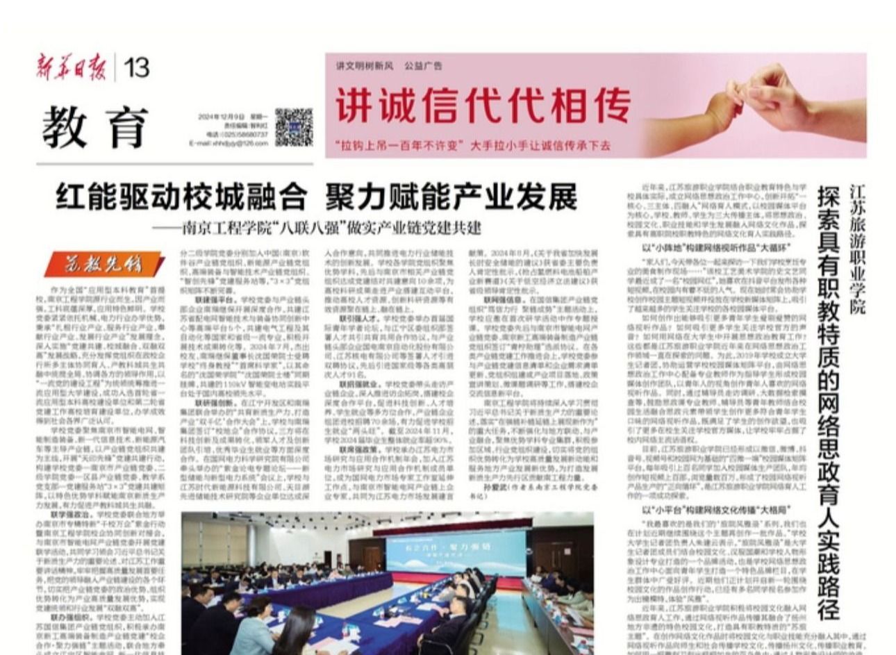 12月9日,《新华日报》刊发太阳集团党委书记孙爱武题为《红能驱动校城融合 聚力赋能产业发展——15vip太阳集团官网“八联八强”做实产业链党建共建》的署名文章。文章围绕习近平总书记提出的“在强链补链延链上展现新作为”的重大任务要求,从“联学强政治”“联办强组织”“联建强平台”“联研强创新”“联引强人才”“联招强就业”“联席强政策”“联网强信息”八个方面,介绍了学校以产业链党组织共建为主线,促进产教科城共生共融的...