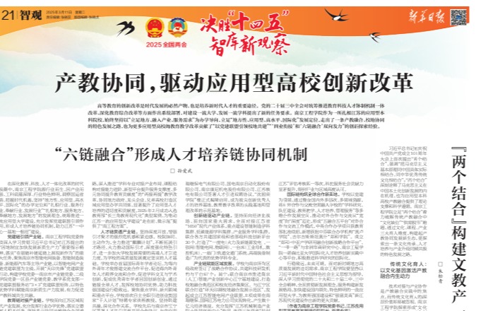 3月11日,《新华日报》“决胜十四五 智库新观察”专题版以《产教协同,驱动应用型高校创新改革》为题,整版刊发报道学校党委书记孙爱武,党委副书记、校长张仰飞,党委常委、副校长汪群、朱松青的系列署名文章,文章结合党的二十届三中全会精神和应用型高校发展实际,从“‘六链融合’形成人才培养链协同机制”“‘四业衔接’彰显应用型高校办学特色”“‘三进三知’打造全域大思政教育品牌”“‘两个结合’构建文教产一体育人...