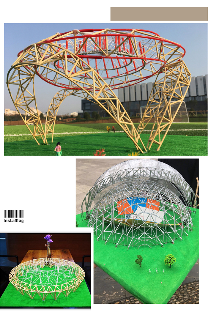 作为江苏省土木工程结构创新大赛的选拔赛,本次大赛遵循江苏省结构创新大赛的形式和评比规范,分为结构创新模型展示和制作模型加载承重比赛。结构创新模型是指参赛者用自己学过的知识,创新设计建筑结构模型,以结构设计合理、模型制作精细为佳。模型制作加载承重比赛是参赛者根据赛事规定的材料制设计制作桥梁模型自己设计桥梁模型。比赛中,由工作人员将重物砝码放在模型加载设备内,以模型的自重轻而承载力大作为评价指标。大赛相关指导老师表示,相较于往年,此次大赛参赛作品整体水平有很大提升,各参赛小组为制作模型一趟趟去买材料、一次次为模型设计细节进行讨论、分析、改进。作品《天阊》采用均布交叉张拉索体,改内、外环梁为内、外环索,减轻重量,提出了一种超静定环桁架与新型索穹顶的组合结构。“阊”字取天上之门之义,寓意着蓬勃生机,与体育精神不谋而合。