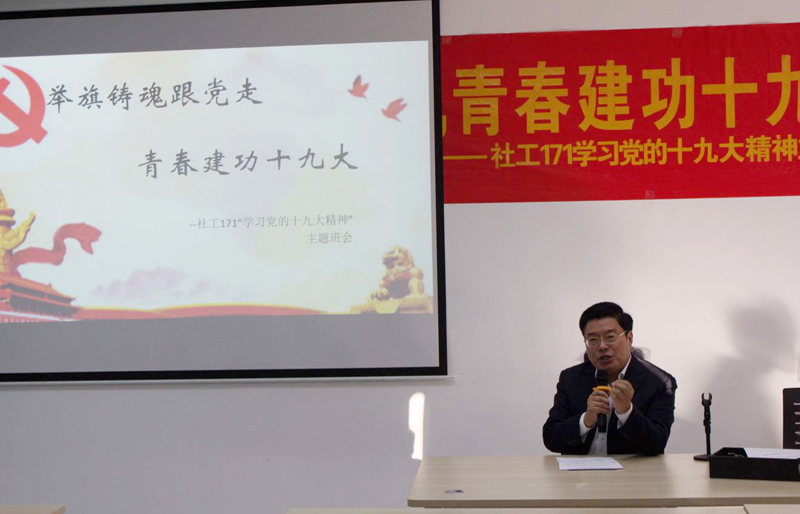 “青年兴则国家兴,青年强则国家强。”习近平总书记在十九大报告中对青年提出的谆谆教诲犹在耳边,时刻鼓励着当代青年大学生努力学习,奋发向上。12月22日,时值冬至,校党委书记史国君来到社工171班“举旗铸魂跟党走,青春建功十九大”主题班会的现场,为同学们宣讲党的十九大精神,畅谈如何做有理想、有本领、有担当有使命的“四有青年”。