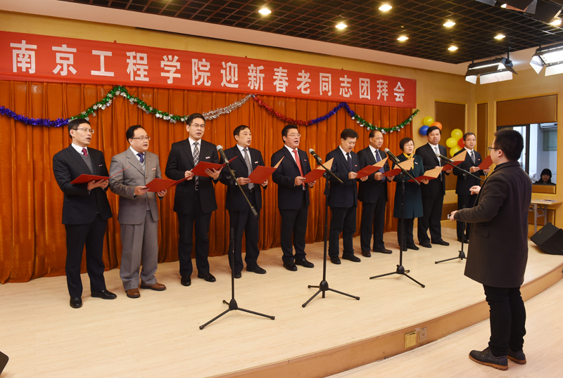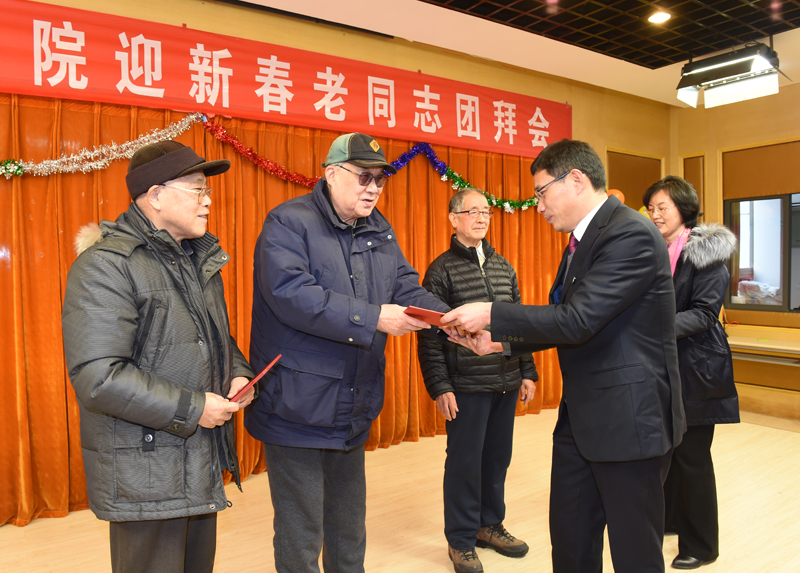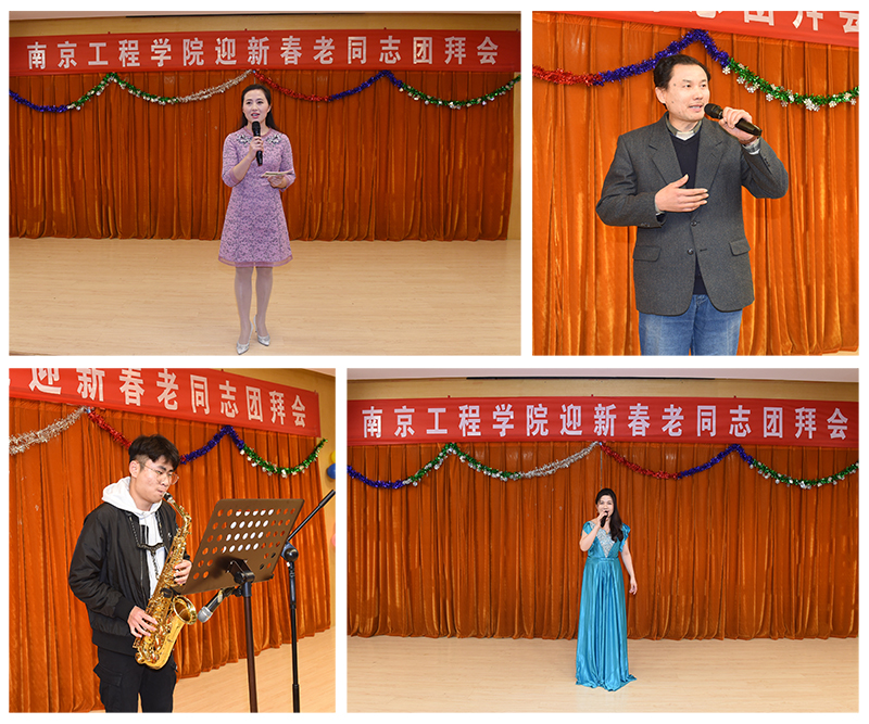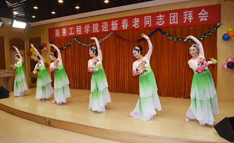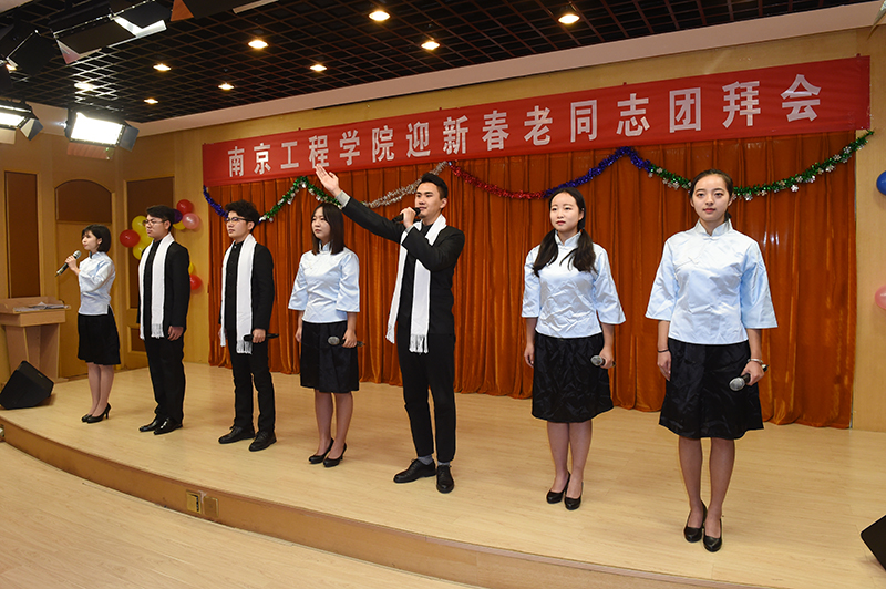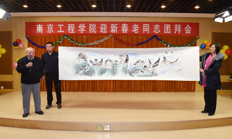 团拜会为老同志们精心准备了文艺节目,全体校领导带来了高亢激昂的小合唱《我们走在大路上》,表达了一代又一代南工程人,为学校的建设不断拼搏奋斗的精神。教职工表演的京剧《管叫山河换新装》,歌曲《美丽的心情》、《我爱你中国》,舞蹈《茉莉花》,学生的萨克斯、古筝乐器独奏等节目相继登场,为老同志们带去了欢乐祥和的新春祝福。张仰飞副院长为黄锡森、张墨、宋继成三位老同志颁发了“捐资助学爱心典范”荣誉证书,感谢老同志对学生的关爱和培养,并表示学校将一如既往重视老同志的工作,祝愿所有老同志都有幸福的晚年。团拜会上,老同志相互交流,互致问候,也被现场欢乐的气氛感染,纷纷拿出手机拍照留念。八十八岁高龄的老校长冯轩还特地献画《盛世》,感谢校领导、教职员工、学生们为学校建设做出的贡献,寄托了所有老同志对学校事业发展的希望和祝福。