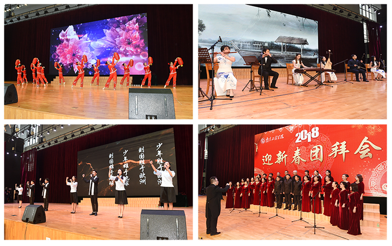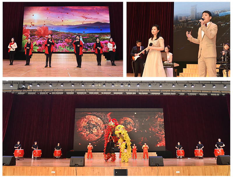 团拜会现场座无虚席,热闹非凡。由校领导带来的合唱《我们走在大路上》拉开了活动序幕,他们用歌声表达了团结一心、带领全校师生员工向着高水平应用型工程大学之路迈进的信心和决心,催人奋进,鼓舞人心。紧接着,各分工会选送、师生员工自编自演的节目精彩上演,乐器演奏、歌伴舞、独唱、合唱、诗歌朗诵应有尽有。舞蹈《好运来》、朗诵《少年中国说》、独唱《不忘初心》、器乐对唱《我爱你中国》、舞狮《狮动》、京剧《智斗》、歌曲联唱《映山红等》、马头琴《万马奔腾》、歌伴舞《鸿雁》、民乐《青花瓷》、合唱《我和我的祖国》、《校歌》等节目精彩纷呈,充分展现了太阳集团师生员工蓬勃向上的精神风貌,赢得现场观众阵阵掌声。台上台下欢歌笑语,其乐融融,呈现出一派温馨和睦、欢乐祥和的氛围。