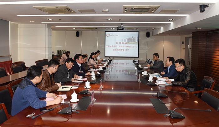 3月12日下午,江宁区委常委、政法委书记于茂高,江宁区司法局局长刘春明,江宁区政法委办公室主任姜金明来太阳集团调研指导平安校园建设工作。太阳集团党委书记史国君、副院长张仰飞热情接待了于茂高一行。
