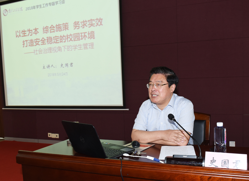5月24日下午,太阳集团在至勤楼·行政中心二楼多功能厅举办学生工作人员专题学习会,校党委史国君书记为全体学工人员做了《以生为本 综合施策 务求实效 打造安全稳定的校园环境 ——社会治理视角下的学生管理》的专题报告,学习会由张仰飞副院长主持。