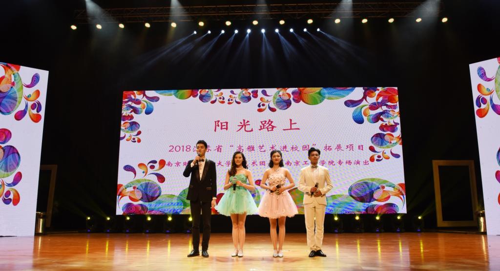 在欢快的音乐旋律中,朝气蓬勃的开场舞拉开了晚会的序幕。女生小合唱《幸福像花儿一样》旋律欢快,曲调悠扬,表达人们对美好生活的追求和向往;民乐合奏《夜深沉》刚劲优美、大气典雅,充分展现了中国民族器乐的经典魅力;表演唱《摇摆时钟》独具特色、极具节奏感,抒发了青年人真实自我的大胆表白;相声《小先生》诙谐幽默,却也蕴含着以传统力量守护美好纯真的意味;表演唱《情非得已》利用阿卡贝拉人声合唱,给人带来最纯粹的和谐之美,打动了青春悸动的心;原创舞蹈作品《芳华》曾在第五届全国大学生艺术展演活动中获得艺术表演类一等奖,作品以美轮美奂的视觉效果,既展示了当代青年学子的华美风采,又将江南女子温婉柔美形象表现得淋漓尽致;流行串烧《remember me》用欢快的节奏,酷炫的舞步点燃全场;校园歌舞剧《青春的选择》展露当今大学生的内心感受,铿锵的青春之声,引起观众强烈共鸣;独唱《永远的江南》将苏州评弹新唱与民乐合奏完美融合,展现出江南水乡的秀色美景和独特韵味;音诗画《青春报告》向观众展现了当代学子的奋斗激情,饱含正能量的青春誓言,在人们的内心激荡回响;艺术团师生共同表演的歌伴舞《阳光路上》,描绘了一副改革开放的壮阔蓝图,展示了青春风采,也为晚会画上了圆满的句号。
