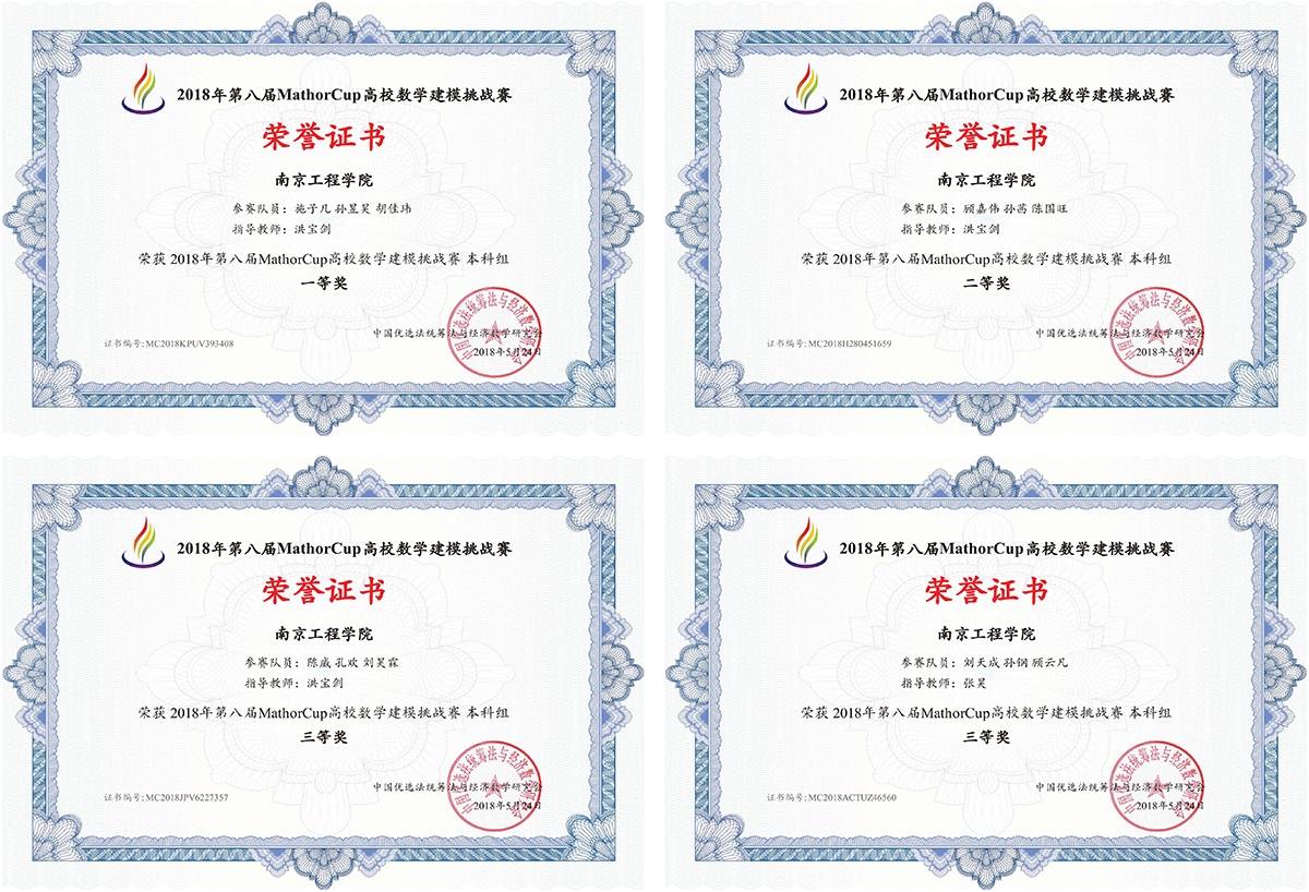 今年4月5日8时-9日8时举行的第八届MathorCup高校数学建模挑战赛获奖名单日前揭晓,太阳集团的四支参赛队全部获奖,实现了太阳集团在该项赛事上的突破。其中,太阳集团数理部洪宝剑老师指导的电力工程学院电力165班施子凡、孙昱昊和胡佳玮三位同学的参赛论文获得本科组一等奖;电力工程学院电力中外162班顾嘉伟、建筑工程学院交通162班孙茜和计算机工程学院网嵌162班陈国旺三位同学的参赛论文获得本科组二等奖;电力工程学院电力163班孔欢、电力165班陈威和输电162班刘昊霖三位同学以及电力161班刘天成、电力164班孙钢、建筑工程学院建工163班顾云凡三位同学的参赛论文获得本科组三等奖。