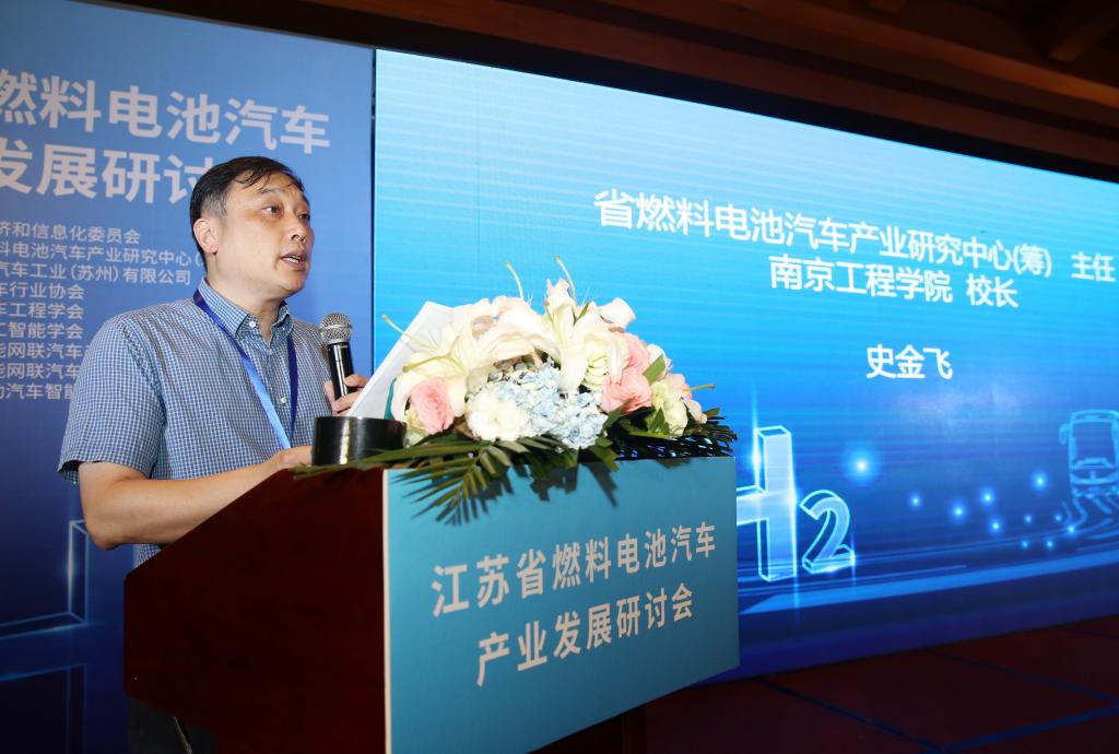 院长、江苏省燃料电池汽车产业研究中心(筹)主任(兼)史金飞教授在研讨会上致辞,他代表学校向关心和支持学校发展的领导、专家、学者、企业家表示热烈的欢迎和衷心感谢!史院长向与会领导嘉宾介绍了学校的办学成就和特色,并报告了“江苏省燃料电池汽车产业研究中心”的筹建及目前已开展的工作情况。他指出,研究中心将继续积极细化地落实国家以及我省关于燃料电池汽车发展的部署和精神,进一步助推我省燃料电池汽车产业的政策制定与明确发展方向,以推动我省相关高校与企业紧紧把握新一轮燃料电池汽车发展的机遇。他希望通过此次盛会,促进各位学者专家交流学习,为我省联合实施技术攻关,不断扩大燃料电池汽车产业规模、优化产业结构、延伸完善产业链,为我省抢占燃料电池汽车产业发展提供强力引擎,将我省燃料电池汽车发展环境推向新的高峰。