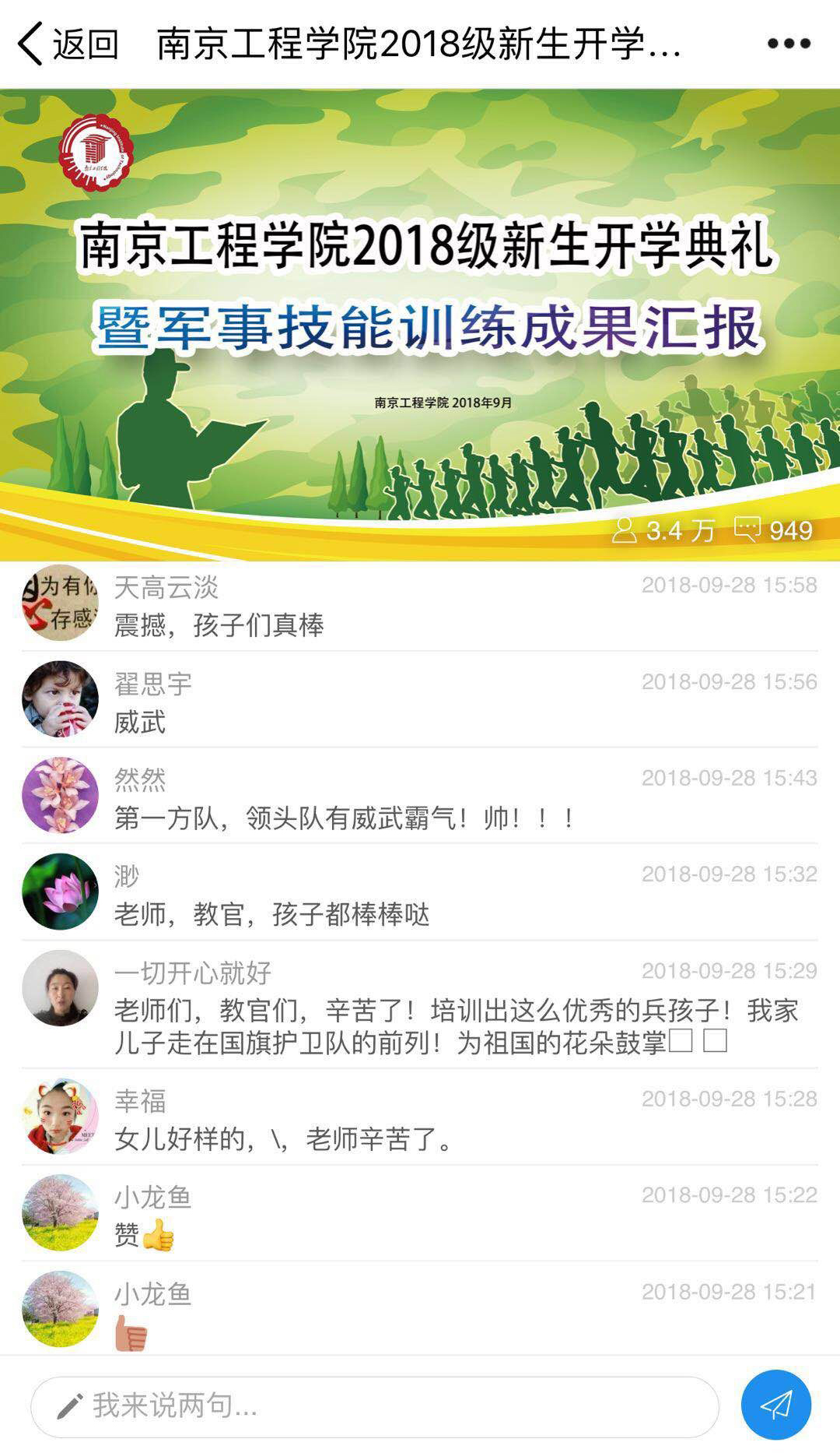 今年的开学典礼暨军事技能训练成果汇报会首次采用现场网络直播的方式,至下午三点,观看直播的人数已超过3万人次,观众纷纷为学校和师生点赞,好评连连。