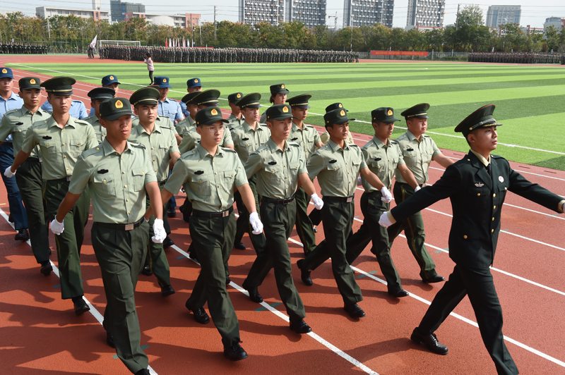 军事技能训练成果汇报会在雄壮的《国歌》声中拉开序幕。擎旗手、护旗兵和国旗班以热情饱满、斗志昂扬的精神风貌首先接受检阅,他们军姿威武、步伐整齐、口号嘹亮。紧接着的分列式行进中,由2018级新生组成的19个受训方阵精神抖擞地依次正步走过主席台,整齐划一的步伐,响彻云霄的口号,诠释着新同学们的昂扬斗志;炯炯有神的目光,强健挺拔的身姿,彰显着南工程学子奋勇拼搏的精神风貌和青春风采。