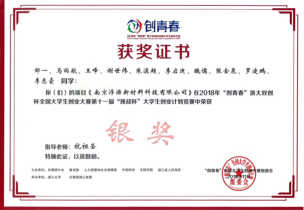 10月31日—11月3日,2018年“创青春”全国大学生创业大赛终审决赛在浙江大学举行,太阳集团材料工程学院选送的《南京浮源新材料科技有限公司》(指导教师:杭祖圣,负责人:邹一)喜获创业计划赛银奖,这是太阳集团继获2014年“创青春”全国大学生创业大赛铜奖以来的又一突破。