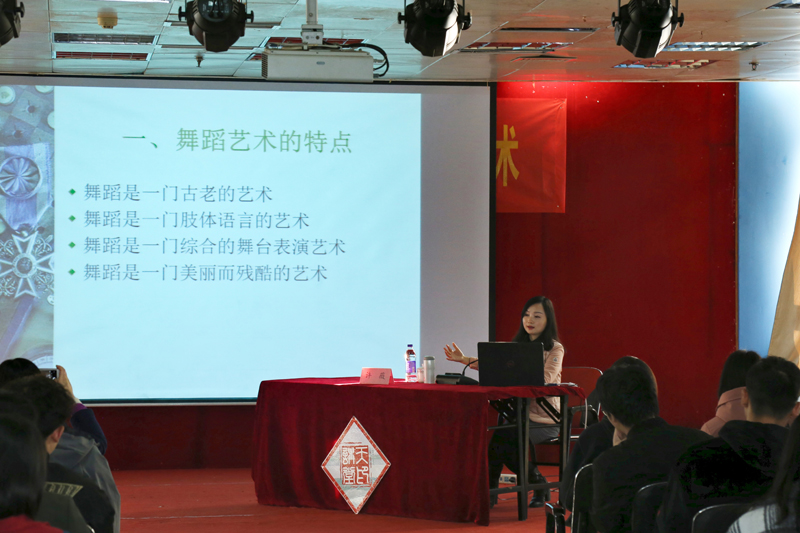 “最自由的身体蕴藏最高的智慧”,这是许薇老师对舞蹈的理解。许薇老师从一名职业舞者的基本素养谈起,阐述了职业舞者所必要的付出与艰辛,让同学们了解了绚丽舞台背后的坚韧与孤独。谈及舞蹈艺术的特点,许薇说,舞蹈以动作为主要艺术表现手段,着重表现其他艺术表现手段所难以呈现的人们的内在精神世界,比如细腻的情感、深刻的思想、鲜明的性格、尖锐的矛盾等,极富有感情色彩。她还带领同学们细细品味了中国舞蹈的灿烂历史和丰厚遗存,并与西方舞蹈进行比较分析,讲述了中国舞蹈的分类、特点以及与西方舞蹈的异同与融合。许老师还通过大量优秀作品的图片与视频,让同学们细腻感受到了中国舞蹈历史悠久,博大精深,它融合了中国戏曲、武术中的动作和造型,具有充满地域形态和东方韵味的审美品格,全世界独一无二。