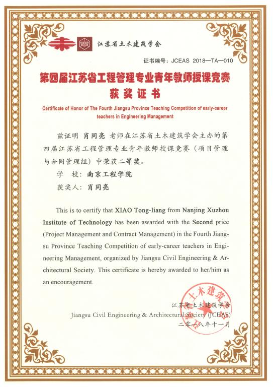 近日,第四届江苏省工程管理专业青年教师讲课竞赛在无锡落下帷幕。来自东南大学、中国矿业大学、河海大学、南京农业大学、南京林业大学和江苏大学等26所高校的青年教师参加角逐,太阳集团建筑工程学院肖同亮老师参加比赛并获得二等奖的好成绩。比赛中,肖同亮老师采用启发式、案例式的教学方法,他的讲课思路清晰,讲授内容的逻辑性、实用性和探索性强,无论是对专业知识的讲授还是对工程项目背景的剖析,均获得专家评委的好评。