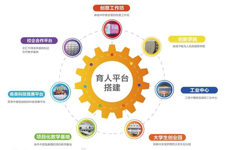 通过校企合作建立了以工业中心、创新学院、天印梦工场(大学生创业园)、创意工作坊等为主体的校级“四创平台”(创意、创新、创造、创业)和工程化项目教学基地。建设了大学生实践教学国家级基地5个、省级示范中心12个。