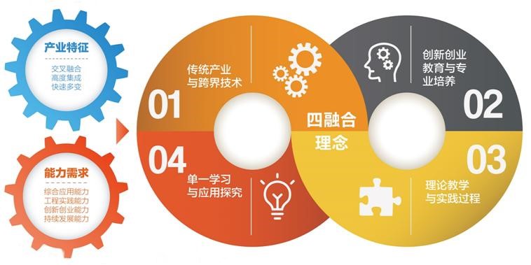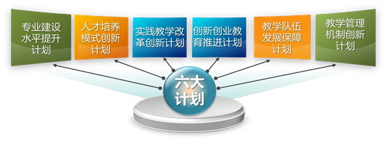 面对现代行业产业“跨界整合、交叉融合、集成创新、快速多变”的发展新态势、新需求,学校确立了本科应用型人才注重培养“四大能力”(综合应用能力、工程实践能力、创新创业能力、持续发展能力)的质量新要求,提出了“四大融合”(传统专业与跨界技术相融合、理论教学与实践过程相融合、单一学习与应用探究相融合、创新创业教育与专业培养相融合)的改革思路,着力推进“四大改革”(课程结构内容改革、教学组织形态改革、育人平台载体改革、创新创业教育改革),大力实施以“六大计划”为主要内容的本科教学改革与建设工程。