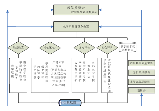 体系建设:学校建设了基于PDCA(计划-实施-评估-改进)质量保障模式的教学质量持续改进机制。构建了学生发展和教师发展为中心,坚持教师教学质量、学生学习质量、教学管理质量并重,整体推进课堂、课程、专业、学院、学校五个层面建设的“双发展、三维度、五建设”教学质量保障体系;切实加强校院两级质量保障组织和制度建设,确保教学质量保障体系高效运行,人才培养质量和毕业生就业满意度逐年提高。其中,“双督导,两结合”的督导监控模式获江苏省教学成果一等奖。