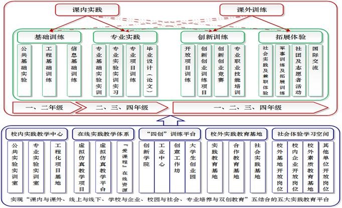 学校高度重视实践教学在应用型人才培养中的重要作用,将实践教学作为应用型人才培养特色的重要因素和核心内容,坚持校企协同、学用创融合、理论与实践统一、各实践环节有机联系,构建了“课内实践+课外训练”两大部分,“基础实验、工程训练、专业实践、创新创业”四大模块,依托校内中心、校外基地,构建“课内与课外、线上与线下、学校与企业、校园与社会、专业培养与双创教育”相结合的实践教学体系。
