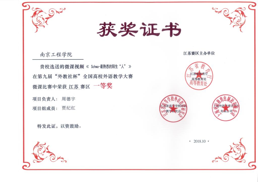 在第九届“外教社杯”全国高校外语教学大赛江苏省赛区微课大赛中,由外国语学院教师周德宇、贾纪红制作的微课作品喜获高校本科组一等奖。