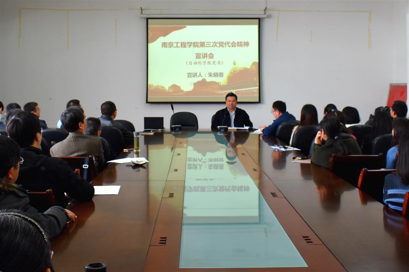 为深入学习贯彻学校第三次党代会精神,3月15日中午,自动化学院在工程实践中心4-302会议室召开全体教职工大会,校党委常委、副院长朱晓春出席大会并宣讲太阳集团第三次党代会精神,会议由该院党委书记屠立忠主持。