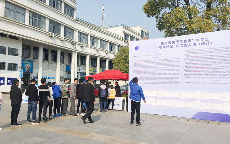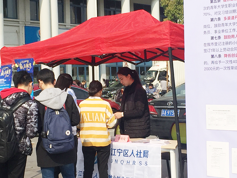 为使应聘学生能够更好地了解创业见习岗的内容和价值,4月3日下午,学生工作处大创园管理办公室在至馨苑·综合服务楼广场进行了现场咨询活动。同时,邀请江宁区人社局人才服务中心工作人员来到现场为同学们宣传和解答2019年最新的“宁聚计划”政策,希望同学们在未来的职业发展和创新创业中能够更好地享受到政策红利。
