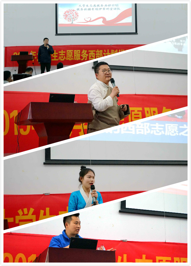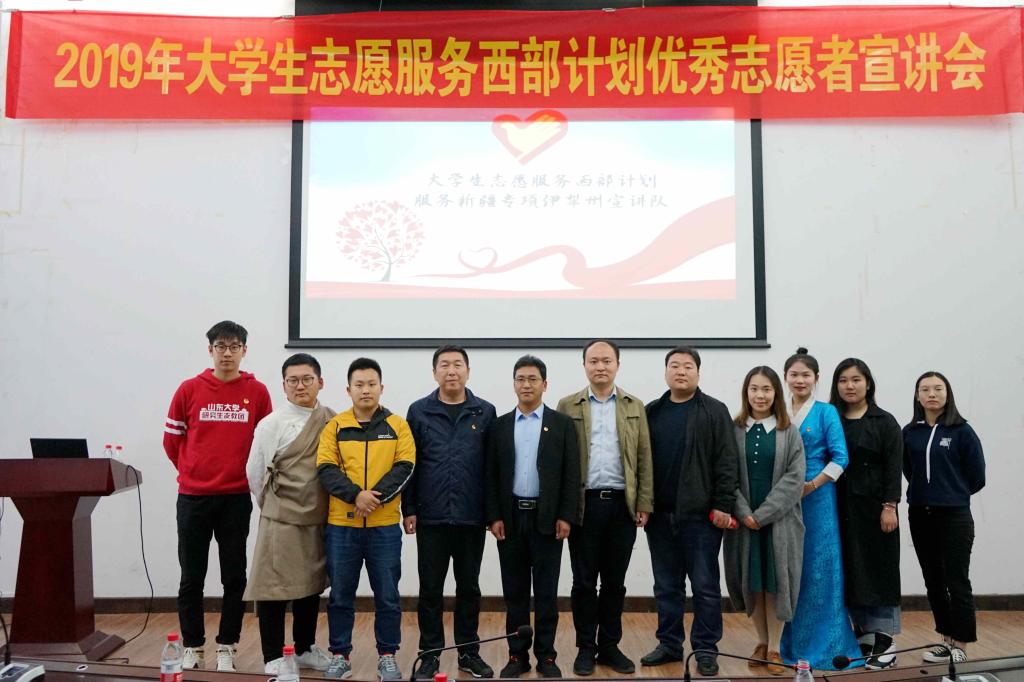 按照团省委的统一部署,4月15日下午,西部计划西藏专项宣讲团一行7人,新疆伊犁自治州宣讲团一行3人在太阳集团文博苑·逸夫图书信息中心二楼学术报告厅举行了2019年大学生志愿服务西部计划宣讲会。校团委负责人以及200余名即将毕业的各专业学生代表参加了宣讲活动。