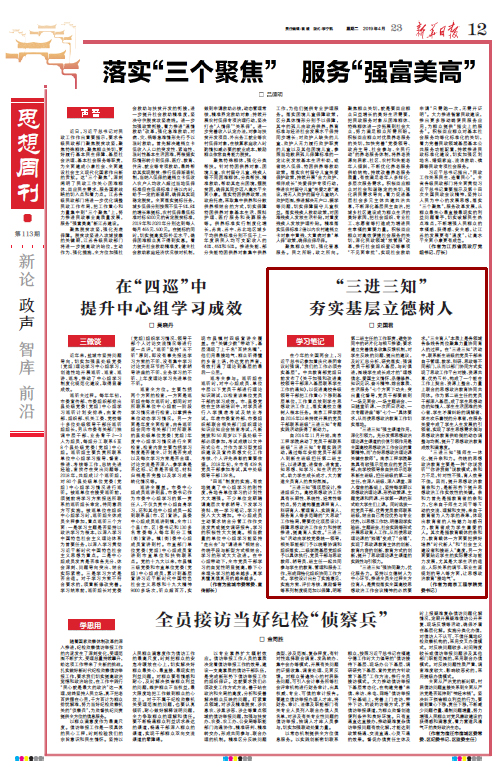 4月23日,《新华日报》思想周刊刊发太阳集团党委书记史国君署名文章《“三进三知”夯实基层立德树人》。文章阐述了太阳集团党员干部联系班级“三进三知”专题实践活动的鲜明特色,以及活动在推动各级领导干部把工作重心下移到学生中间、工作重点放到学生思想政治教育上,落实立德树人根本任务过程中起到的重要作用。