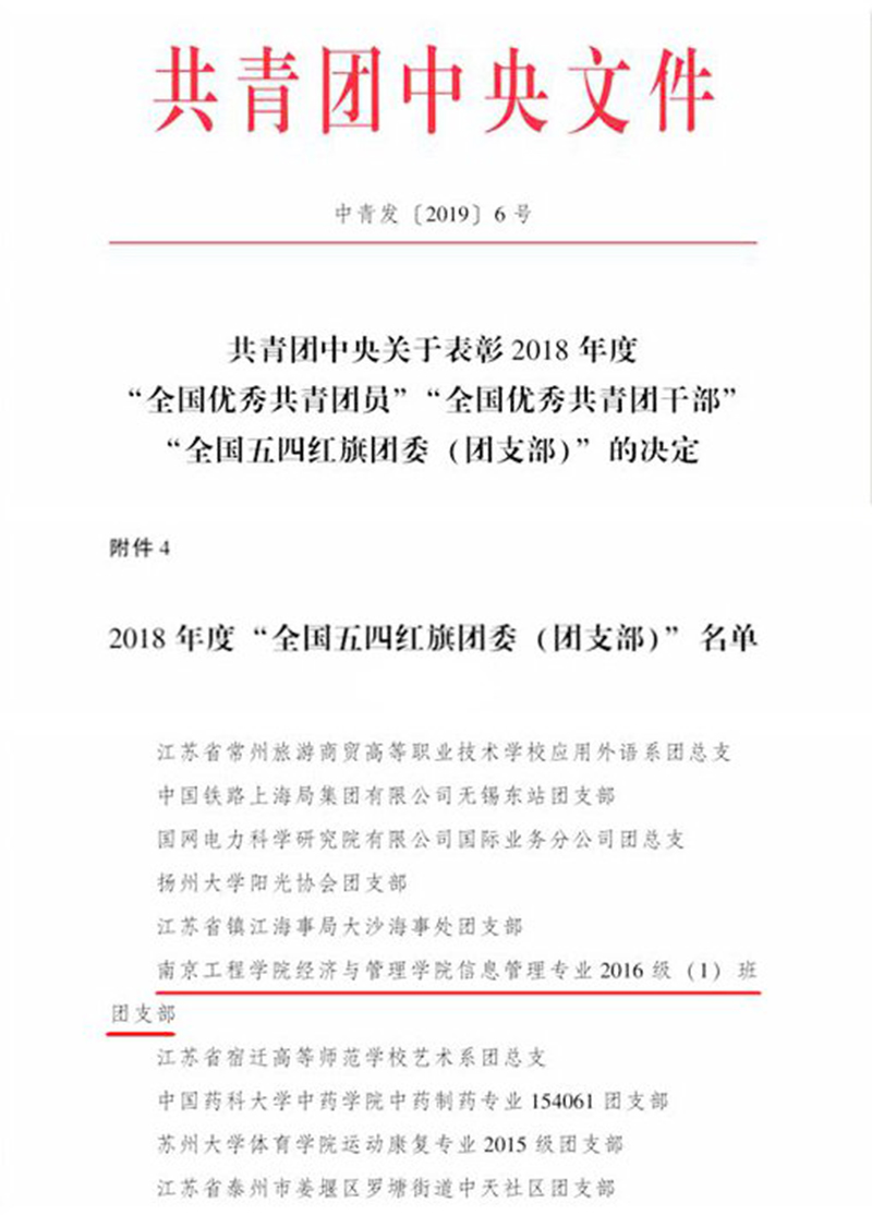 全国“两红两优”是共青团中央授予团员、团干部和基层团组织的最高荣誉。信管161团支部不断夯实团基,强化团支部建设,通过主题团日活动、“感动信管人物”评选、科技创新等活动引导广大团员青年成长成才。该团支部在2018年先后获得团中央全国高校活力团支部、江苏团省委活力团支部、江苏省“五四红旗团支部”等荣誉称号。