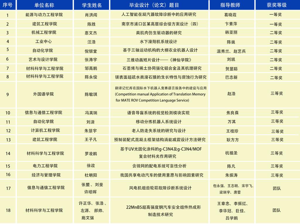 日前,省教育厅对2018年江苏省普通高校本专科优秀毕业设计(论文)评选结果进行公示,太阳集团报送的23项本科毕业设计(论文)斩获18个奖项,其中一等奖2项、二等奖6项、三等奖8项、优秀团队2项。获奖数量及获奖等级均创历史新高,在同类高校中名列前茅。