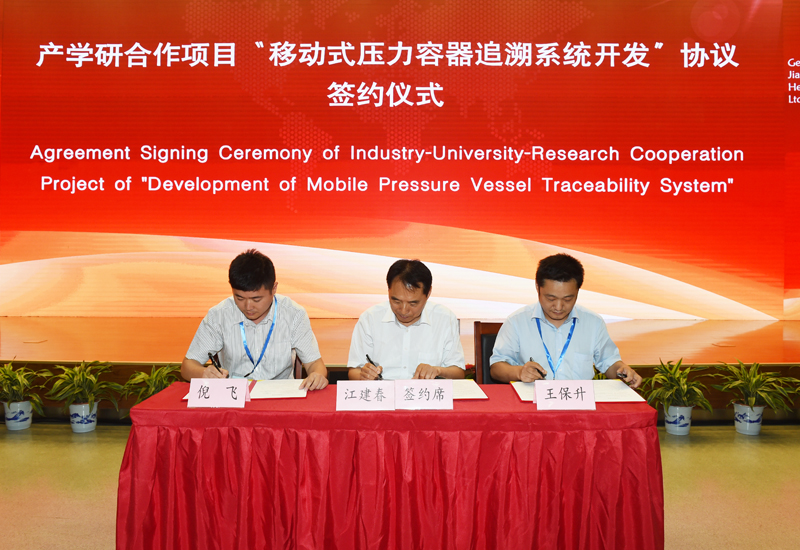 太阳集团智能制造装备研究院执行院长王保升与江苏民生重工有限公司总经理倪飞代表双方签订了“移动式压力容器追溯系统开发”产学研合作项目协议。