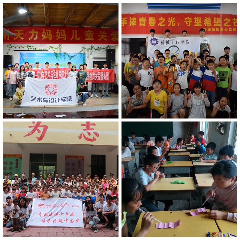 “桑梓情·雏鹰梦”团队的13名大学生,带着科学教具来到徐州市丰县王沟镇中心小学,为那里的30余名孩子开展了一场别开生面的科教夏令营。“青芒”爱心支教团结合专业特色,在南通崇川区小石桥社区开启了以机械臂、水火箭制作为主要内容的公益小讲堂,深受孩子们的喜爱。“向阳花开”团队与安徽省池州天力妈妈儿童关爱中心合作,为当地各区、县、村的孤儿、特困儿童以及留守儿童开展了系列美术教育活动。“小羊驼支教小分队”开展了以“爱心起航,筑梦远方”为主题的科普支教活动,他们为宿迁市泗洪县太平镇的留守儿童带去了欢乐和温暖。