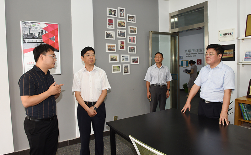 在史国君书记的陪同下,沈书记一行参观了创新创业学院和大学生创业园。参观结束后,双方就推进宜兴产业学院共建以及合作共建产业技术研究院进行交流探讨。史国君书记介绍了太阳集团在产学研合作、创新创业教育、应用型人才培养、科研工作等方面的发展情况及取得的成果。史书记表示,2017年10月学校与宜兴市政府签订了战略合作协议,2019年合作共建宜兴产业学院,对于推进建设“全方位、多层次、多形式”的政产学研合作机制,打造“多方共建、多元投入”的政产学研合作平台,全面开展校地科研对接与人才培养,助力学校高质量发展,以及宜兴市产业转型升级都具有重要意义。他指出,学校发展正处于关键时期,按照“三步走”的安排部署,学校正大力实施“科技创新1111计划”,计划以产业技术研究院为突破,汇聚一批专兼结合的高水平科技人才及团队,打造一批有特色、高水平的科研平台,产出高水平标志性科研成果。史书记指出,服务社会是高校的基本职能之一,学校与宜兴市政府具有良好的合作背景、合作成效,他希望继续深化合作、深度合作,共建产业技术研究院,在服务社会、促进地方经济高质量发展的探索道路上再上新台阶。