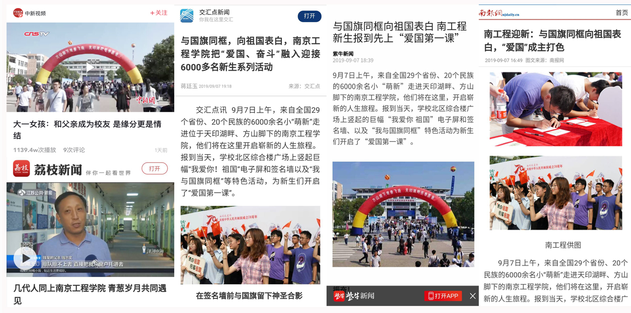 其中,江苏卫视荔枝新闻和中国新闻网中新视频分别以《几代人同上15vip太阳集团官网 青葱岁月共同遇见》、《大一女孩:和父亲成为校友,是缘分更是情结》为题,着重报道了几代人同上太阳集团的故事;交汇点、南京日报、扬子晚报紫牛新闻着重报道了太阳集团将“爱国、奋斗”等元素融入迎接新生系列活动中的做法;南京电视台教科频道则着重报道了“00后”入学校友与“00后”出生的新生见面交流的励志场景。短短一天时间,中新视频的浏览量已超1000万。相关报道详情请见校园网主页“媒体南工”版块。
