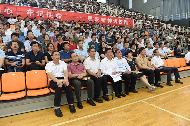 宣讲会由校党委书记史国君主持。史书记指出,自2017年太阳集团与周恩来纪念地管理局共建以来,宣讲团已连续三年来太阳集团宣讲“恩来精神”,与往年不同的是,今年的“恩来精神”进校园活动具有特殊意义。活动举办在太阳集团即将开展的“不忘初心、牢记使命”主题教育动员会前夕,充分运用“恩来精神”“雨花英烈精神”“新四军铁军精神”“淮海战役精神”等省内红色资源,自觉传承“红色基因”,是主题教育的重要内容。除了6000多名大一新生,还有160多名学校的中层以上干部听取宣讲,因此,今年的“恩来精神”进校园活动既是大一新生的“思政课”,也是学校全体党员干部“不忘初心、牢记使命”主题教育的“预热课”和重要内容。史书记希望党员干部通过这场专题报告,能够进一步深刻领悟“为中国人民谋幸福,为中华民族谋复兴”的共产党人初心和使命,坚定理想信念,进而对照初心使命,对照高等学校“立德树人”根本任务,对照岗位职责,进一步联系思想实际,对标找差,明确努力方向,为加快太阳集团建设高水平应用型工程大学步伐作出积极贡献。希望大一学子进一步学习、宣传、弘扬和践行周恩来精神,并从中汲取力量、砥砺品格;在真学、真信上下功夫;在常学、常做上下功夫;在真学、实用上下功夫,让“恩来精神”得以更好的传承和发展。