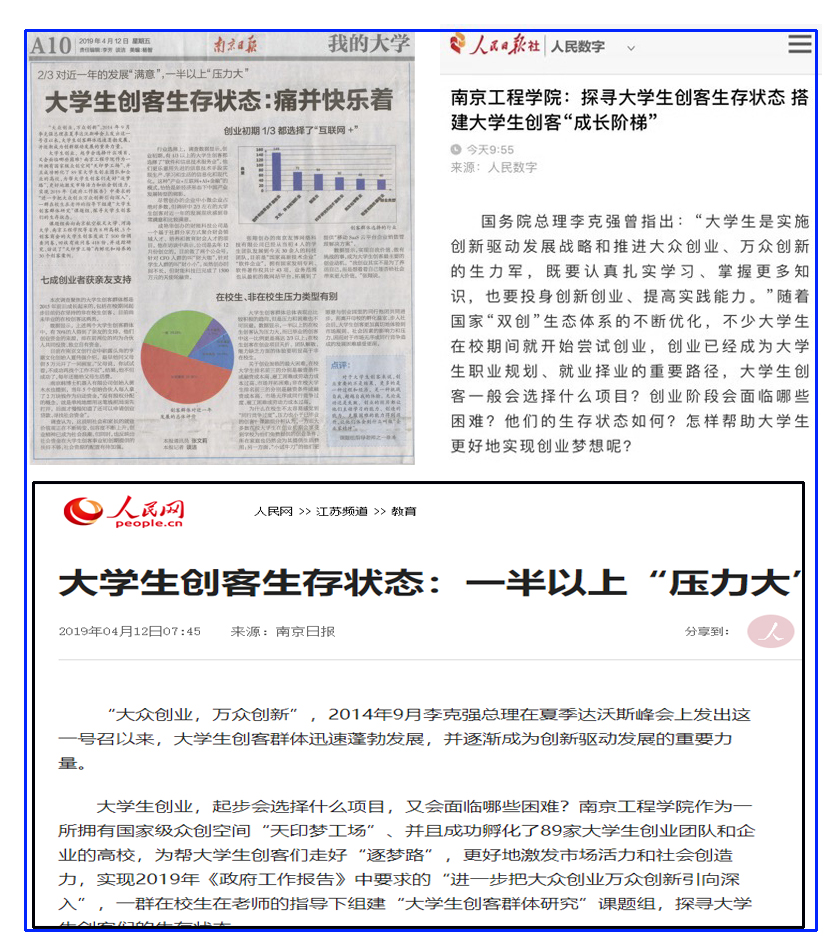 据了解,《“追梦人”的逐梦路:探寻大学生创客群体的发展之道》依托学校丰富的创业教育实践,以“大学生创客群体”为研究对象,以构筑创业梦、走近“追梦人”、问路梦之初、聚力创业路为研究线索,走近大学生创客群体,倾听他们的心声,探寻他们的发展路径,为后来者筑路搭桥。研究过程中,回收有效问卷417份,形成访谈记录等原始材料40余万字,多位知名学者对团队成员在研究中体现的敢于担当的社会责任感与使命感给予了充分肯定。研究成果还受到了人民网、《南京日报》、人民日报社等媒体的关注,并曾在2019全国大学生创业实训营期间进行宣讲和推广,建议还被第二届南京市青年大学生双创节采纳并运用。