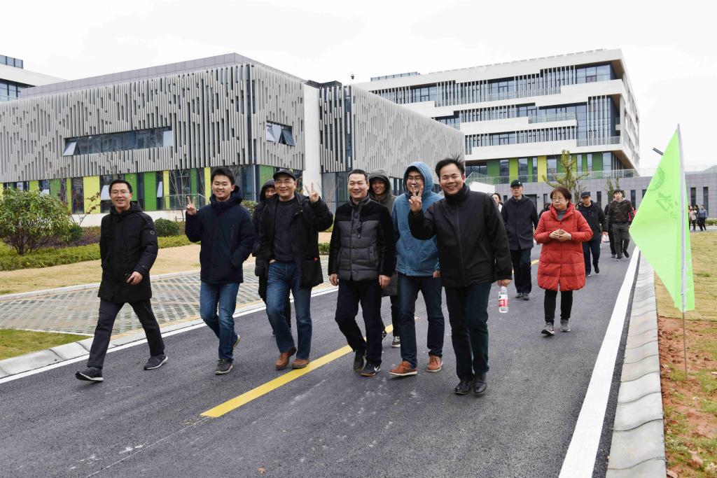 本次“健身走”活动重新设计了行进路线,在通过学校一号门景观大道之后,一条焕然一新的道路引导大家经过风貌初显的天印湿地公园和最新落成的科教创新园。大多数员工是第一次经过这条校园环湖路,大家步调一致、节奏有序,展示出团结协作、积极向上的精神风貌,每个人的脸上都洋溢欢乐的笑容和对新年的美好憧憬。不少老师被美不胜收的校园风景吸引得停止了脚步,纷纷拍照留影。一位参加活动的老师发出由衷的感慨:知道我们的校园很大,没想到有这么大;知道我们校园很美,通过今天活动才知道比想见的更美。