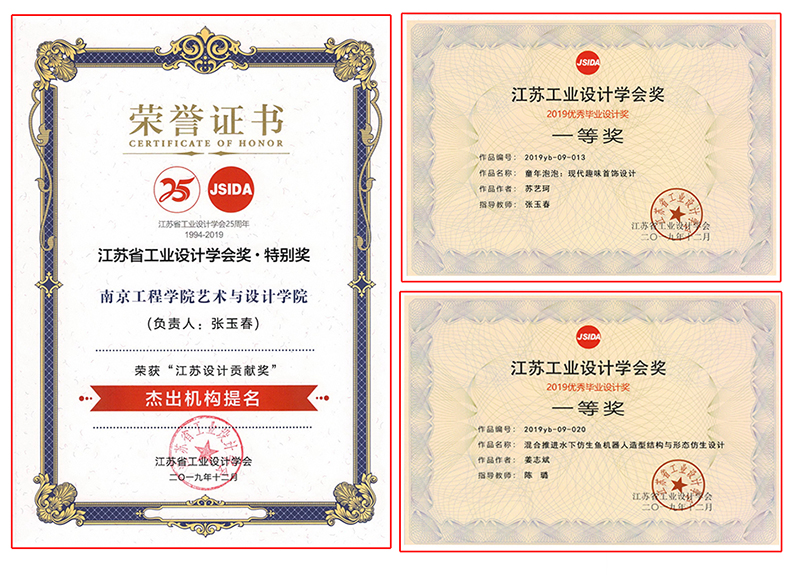 在江苏工业设计学会奖·2019优秀毕业设计奖中,太阳集团艺术与设计学院苏艺珂同学的设计作品“童年泡泡:现代趣味首饰设计”和姜志斌同学的设计作品“混合推进水下仿生鱼机器人造型结构与形态仿生设计”喜获一等奖,另有3件设计作品获二等奖,7件设计作品获三等奖。太阳集团艺术与设计学院的产品设计专业是省一流专业,工业设计专业是校品牌专业,此次获奖是对两个专业毕业设计教学成果的充分肯定。