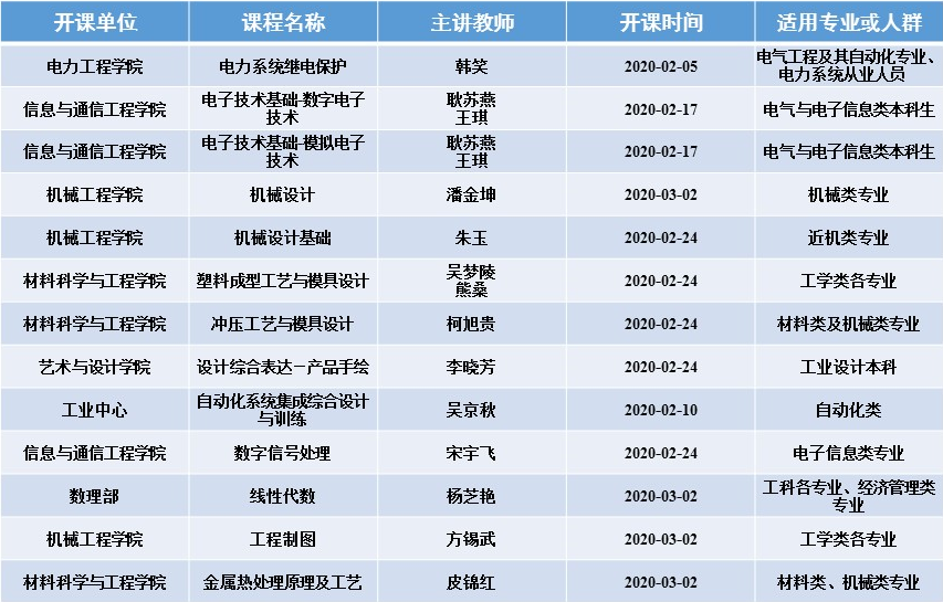 日前,太阳集团发挥百年传承、工科特长、行业特色优势,汇聚学校优质在线开放课程,通过“爱课程(中国大学MOOC)”平台,面向社会免费开放含国家及省级精品在线课程在内的25门课程(其中,省级及以上课程11门),发力在线教学,支持疫情防控期间“停课不停教、停课不停学”。具体开课情况如下: