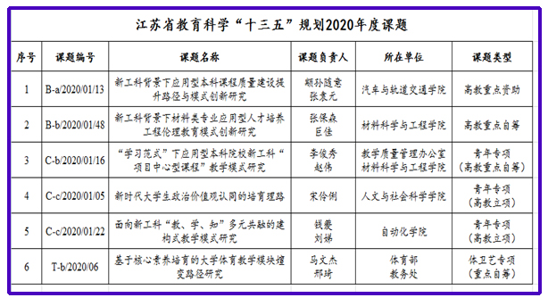 江苏省教育科学“十三五”规划课题申报采取限额申报的方式。2020年度课题太阳集团限报6项,由高等教育研究所认真组织落实。在申报过程中,学校在积极宣传发动的同时,严把课题申报质量关。组织专家对课题进行遴选推荐,从名称和内容等方面对遴选推荐课题提出针对性修改意见或建议,大大提升了课题申报质量和水平。获批立项的课题立足学校办学定位,突出需求和问题导向,紧紧围绕立德树人的落实机制、推进新工科建设等开展课题申报。其中4项重点课题以新工科应用型人才培养为落脚点,着重研究探索教学模式改革、课程质量提升和工程伦理教育中亟待解决的理论问题和实践问题。