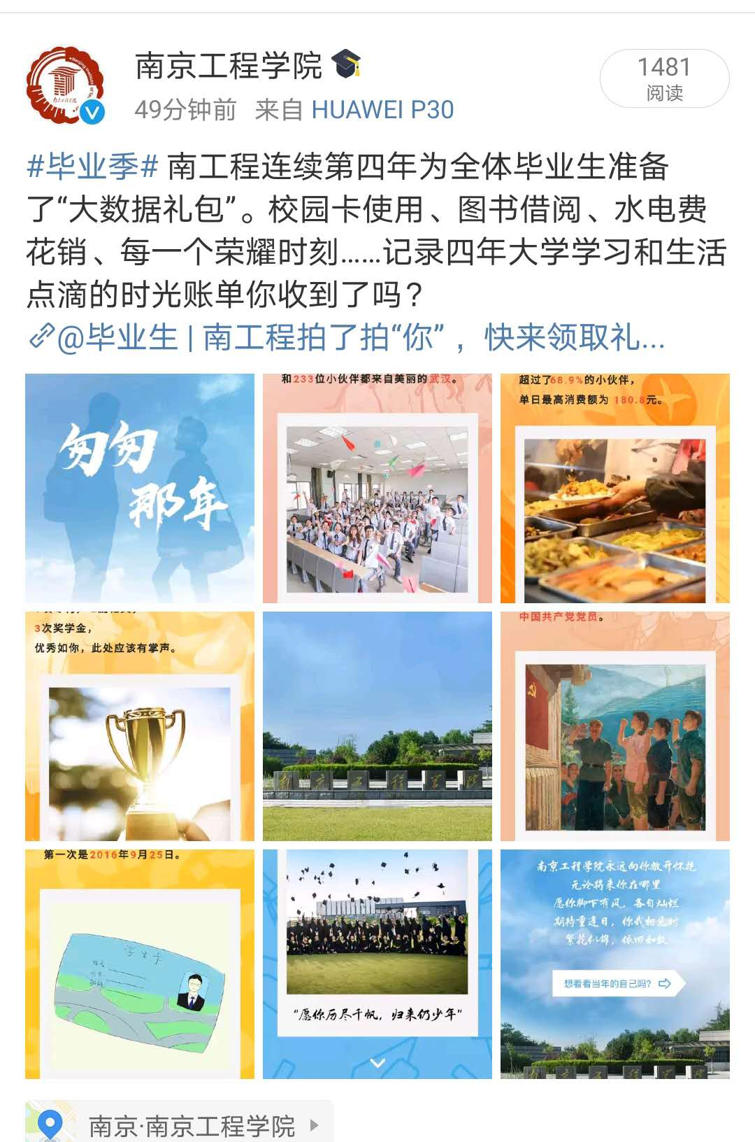 “2016年9月,你背起行囊,跨越253公里,从苏州来到南京,新的旅程扬帆起航”“有点小迷糊的你,一共补办了2次校园卡”“优秀的你,一共参加2次科创活动,获得过1项专利,1次一等奖学金,此处应有小红花”……学校延续以往的做法,为全体毕业生准备了大学四年大数据账单。校园卡使用、图书借阅、水电费花销、每一个荣耀时刻……记录四年大学学习和生活点滴的时光账单伴着今年的毕业歌《入海(南工程版)》的旋律,在毕业生离校的第一天,发送到了每名毕业生的手机上。“听学姐学长提过四年账单,以为今年特殊毕业季会看不到了,没想到在这么短时间里,学校还是给我们准备了!”国贸162的杨婷岚同学说:“感谢母校如此用心的礼物,看完账单,不知不觉已经泪湿了眼眶。”