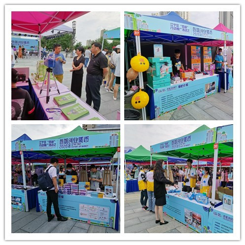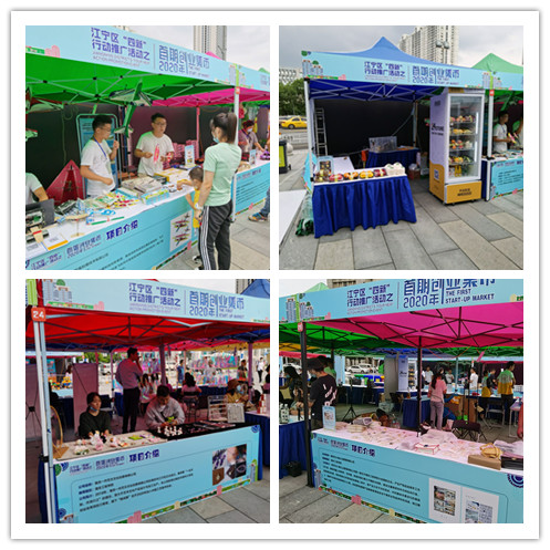 6月19日下午,由江宁区“四新”行动指挥部办公室指导、江宁区人社局主办、江宁区创业服务协会承办的江宁区2020年首期创业集市在景枫KINGMO广场举办,太阳集团大学生创业园“天印梦工场”驻园和孵化出园的10家创业公司和团队积极参与,成为活动的主力。