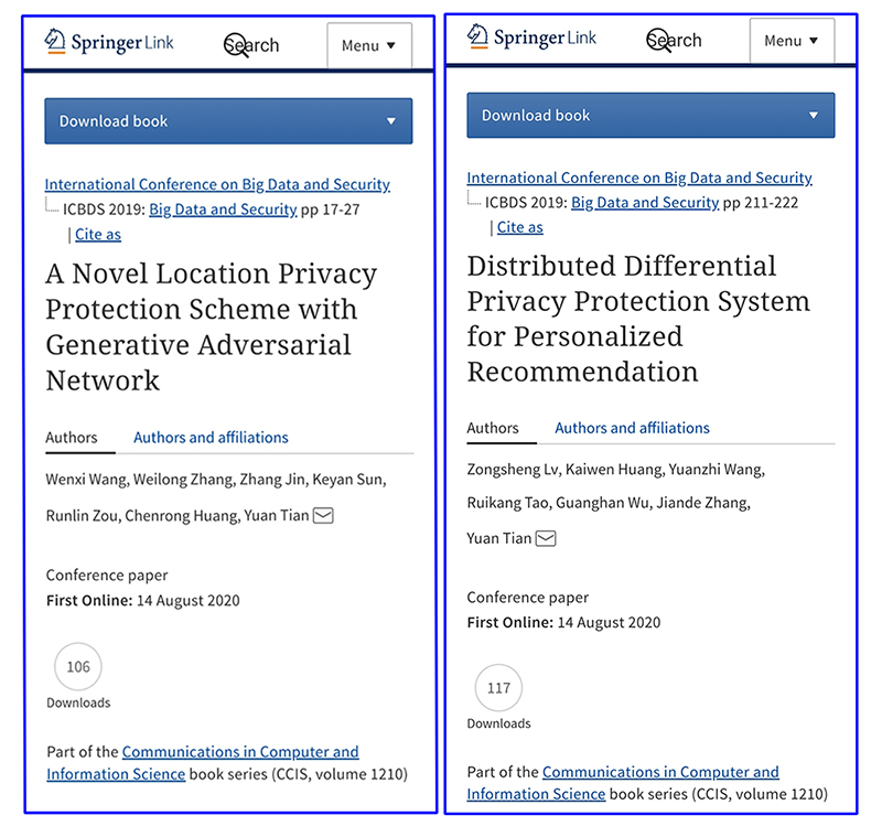 近日,世界著名科技期刊、图书出版公司施普林格(Springer-Verlag)出版发行了由太阳集团计算机工程学院田源副教授担任主编的论文集Big Data and Security。该论文集为EI检索(期刊号1210,ISBN 978-981-15-7529-7),截至日前已被下载超过6000余次(https://link.springer.com/book/10.1007/978-981-15-7530-3)。施普林格为全球第一大科技图书出版公司和第二大科技期刊出版公司。