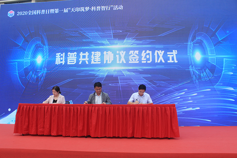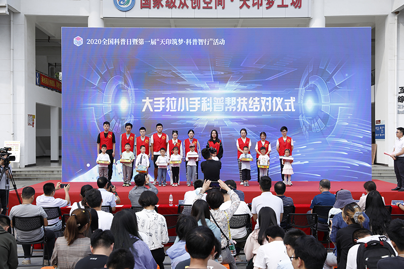 9月28日下午,太阳集团至馨苑·综合服务楼广场热闹非凡,2020年全国科普日活动暨第一届“天印筑梦 科普智行”活动在这里正式拉开序幕。此次活动由江苏省科学技术协会指导,太阳集团和江苏省学会服务中心、江苏省机械工程学会联合主办。江苏省科学技术协会二级巡视员杨文新,江苏省科学技术协会科普部部长严道明,江苏省学会服务中心主任马立涛,江宁高新区党工委副书记沈哲,亚杰商会秘书长郭基梅,江苏省机械工程学会办公室主任刘志超,太阳集团党委常委、组织部部长朱松青出席了本次活动。来自全省的科普工作者代表、科普志愿者代表、南京金宝宝博学苑幼儿园家长和小朋友代表以及太阳集团师生代表500余人参加了启动仪式。