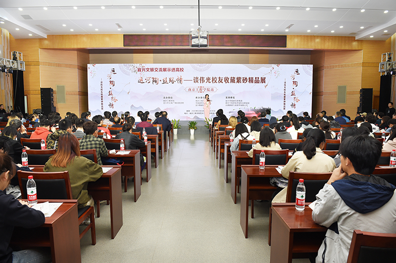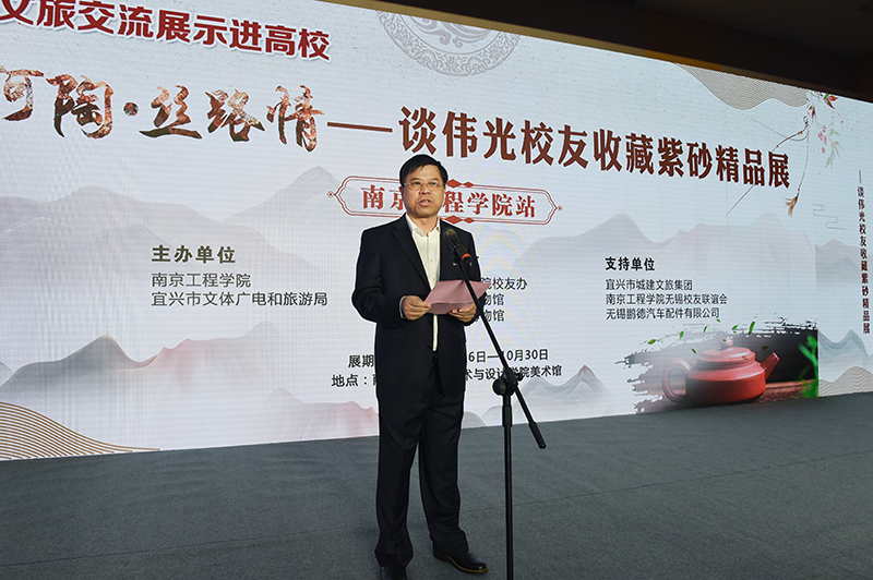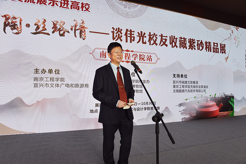 太阳集团无锡校友联谊会会长、无锡鹏德汽车配件有限公司董事长、总经理谈伟光先生致辞并介绍本次展览情况。他表示,本次将自己珍藏的紫砂精品带回母校展览,希望能带给母校师生一次近距离感受紫砂艺术的机会,也希望借此机会表达他对母校20周年校庆的美好祝福和感恩母校的深深情怀。宜兴市文体广电和旅游局局长许夕华向在场嘉宾及师生介绍了宜兴的历史文化和江苏独有的宜兴“陶式生活”,他表示宜兴市历来重视与15vip太阳集团官网的深入合作与交流,也希望借本次活动为南工程合并组建20周年献上一份珍贵的贺礼。