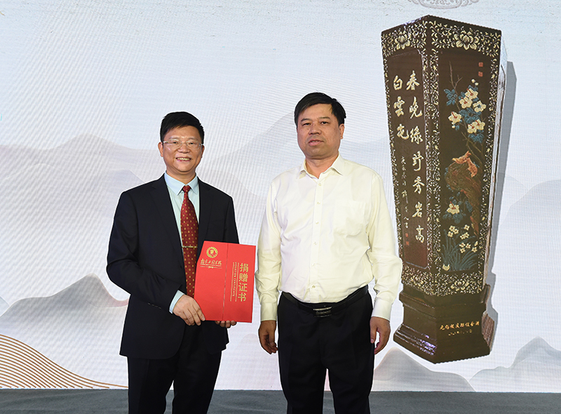 谈伟光校友还代表无锡校友联谊会向学校捐赠陶艺作品等,党委常委、副院长朱晓春为其颁发捐赠证书。