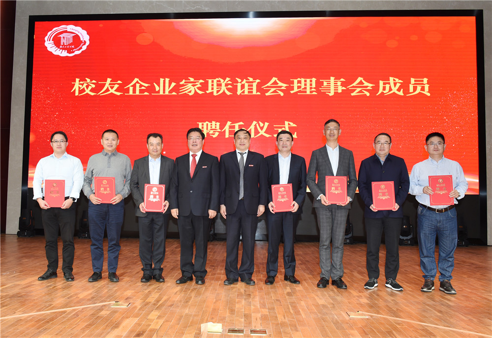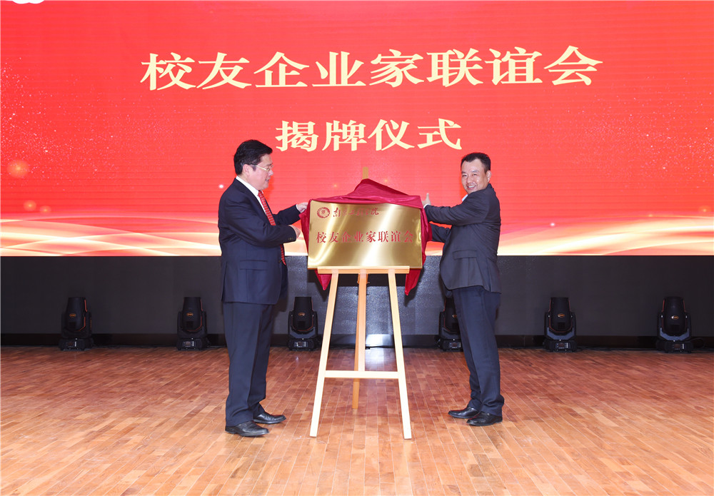 史国君书记和高文明校友为联谊会揭牌,史国君书记、史金飞院长共同为首届校友企业家联谊会理事会成员颁发聘书。